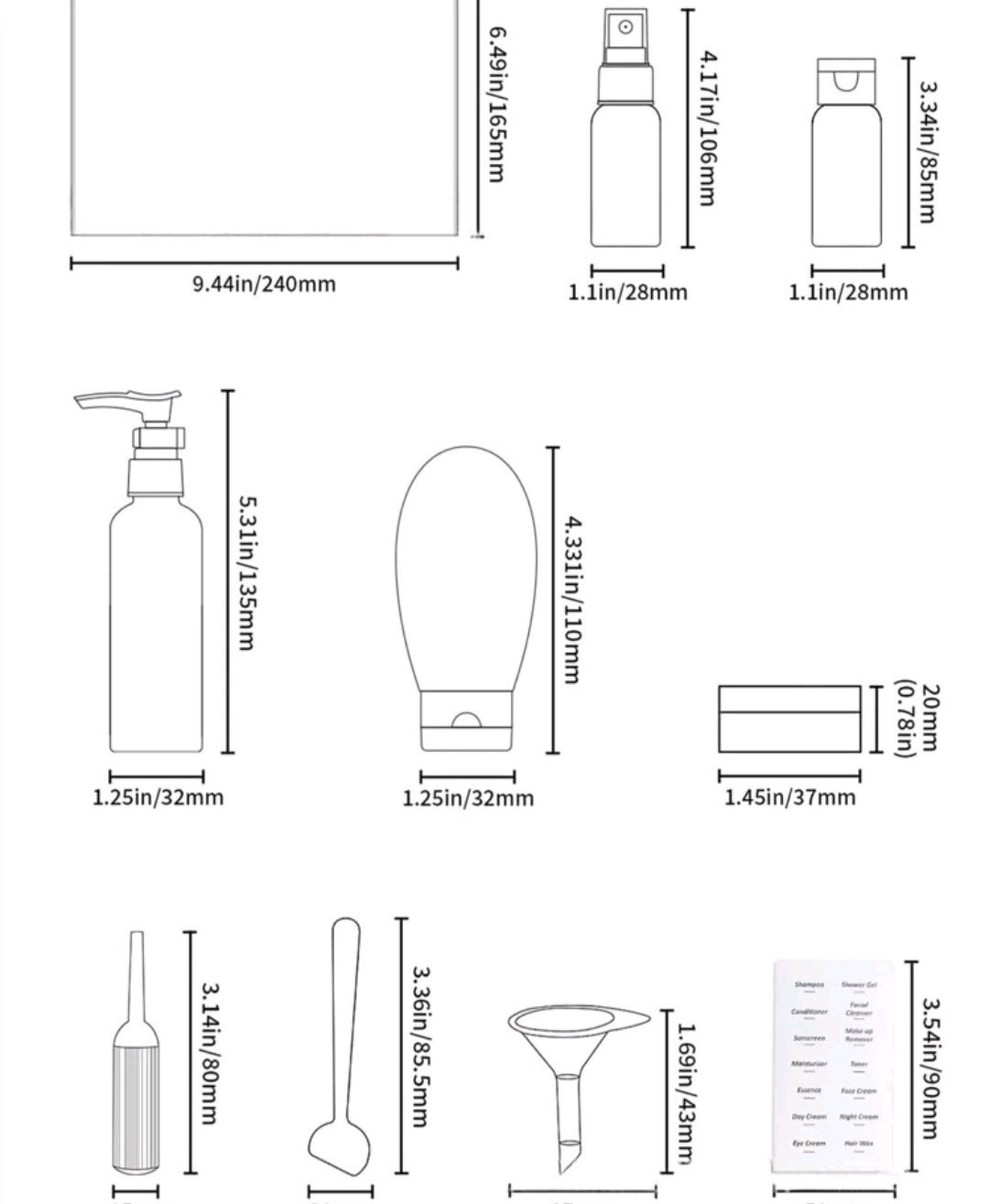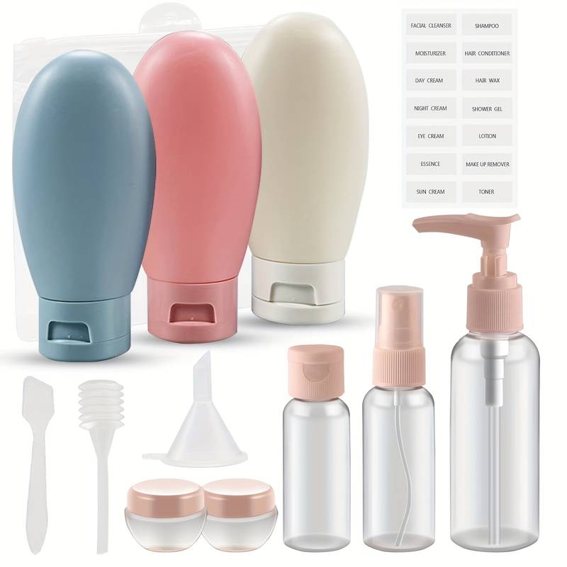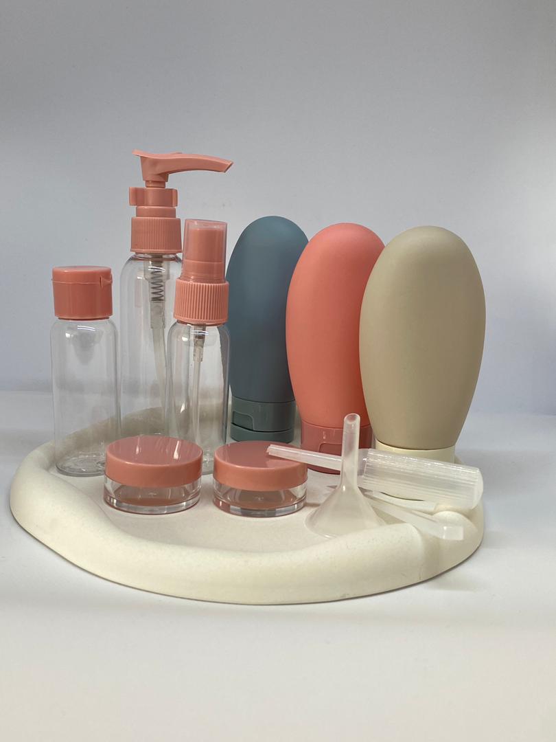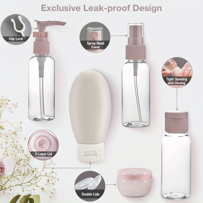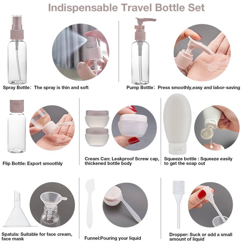 به جای حمل ظروف بزرگ شامپو، ماسک مو ، تونر و … در سفرها،  با استفاده از این ست سفری به راحتی می‌توانید مقدار مورد نیاز از محصولات مراقبت شخصی: شامپو، کرم، ژل، ماسک مو  و .. را بدون اشغال فضا همیشه با خود حمل کنید. درهای این جا شامپویی‌ها و سایر ظروف باز نمی‌شود و محتویات آن نمی‌ریزد. همچنین تعدادی پرچسب با عناوین متفاوت در داخل پک وجود دارد که برای تشخیص محتویات می‌توانید روی آن‌ها بچسبانید.